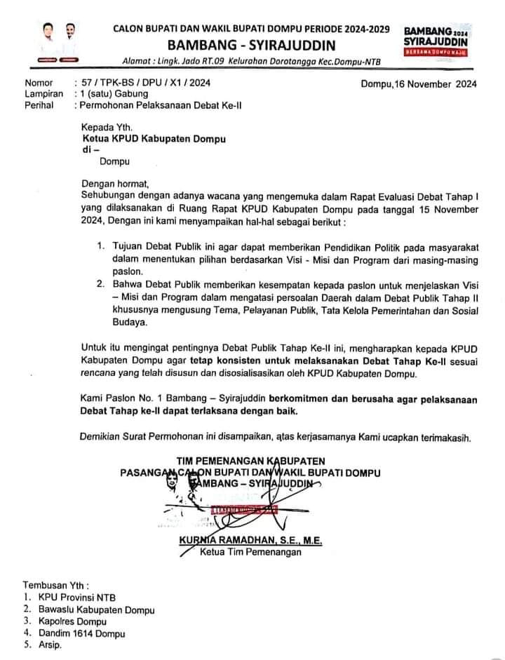 "Kami minta kepada KPU Dompu agar tetap konsisten untuk melaksanakan Debat Tahap ke II sesuai rencana yang telah disusun dan disosialisasikan oleh KPU Kabupaten Dompu. Kami dari Paslon Nomor Urut 1 Bambang-Syirajuddin berkomitmen dan berusaha agar pelaksanaan Debat Tahap ke II dapat terlaksana dengan baik,"kata Kurnia Ramadhan, SE,ME selaku Ketua Tim Pemenangan Paslon BBF-DJ dalam Surat Permohonan Debat Tahap Ke II yang dilayangkannya ke KPU Dompu.